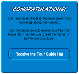 Once you have completed the quiz, the tour guide hat should be added in to your inventory and then you can put it. Flippy3156 of flippy3156 site (your link here more info). You are now ready to give. Once you have completed the quiz, the tour guide hat should be added in to your inventory and then you can put it on and help other penguins around the island of club penguin. I dont think u can be a tour guide without being that age (from clubpenguin).