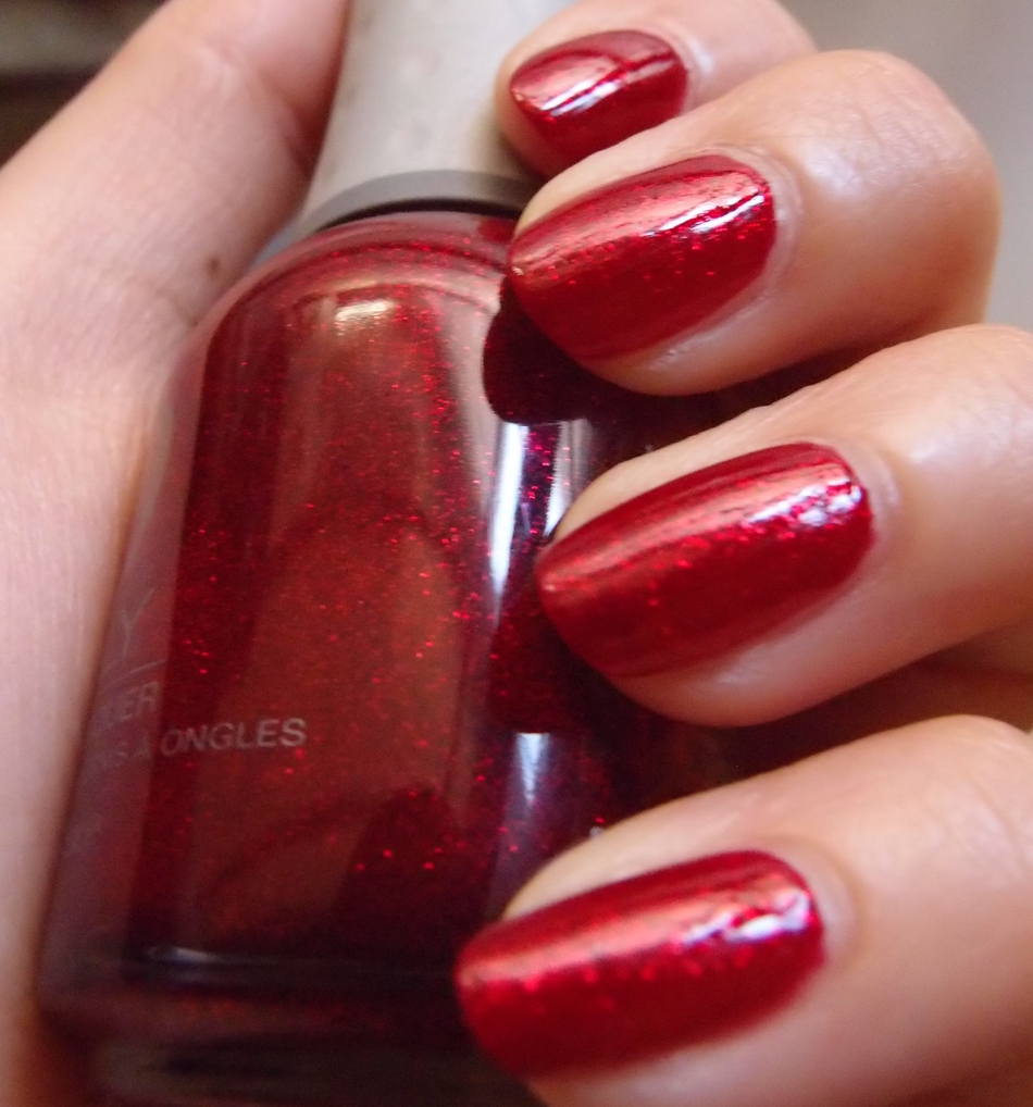 is thin it spreads easily and dries fast so three coats isn't really a chore. You also get great depth with increasing layers. It can look pretty vampy in dimmer light but it definitely sparkles a bright red in the light.